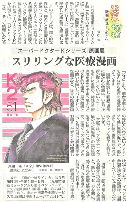 北九州市漫画ミュージアム6階「あしたのギャラリー」にて、来年2月21日から4月12日まで、漫画家・真船一雄先生の代表作『スーパードクターKシリーズ』通算千話を記念した原画展を開催します。