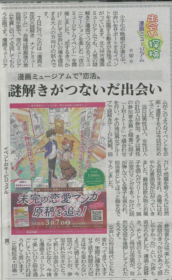 少子化や晩婚化が進む中、出会いをサポートするイベントを企画する動きが各地で広がっています。北九州市漫画ミュージアムでも、人気の謎解きと漫画でつながるコミュニケーションを楽しむ「夜のミュージアムイベント」を開催しました。“恋するきっかけ”として出会いの場を提供する大人の方向けの試みです。