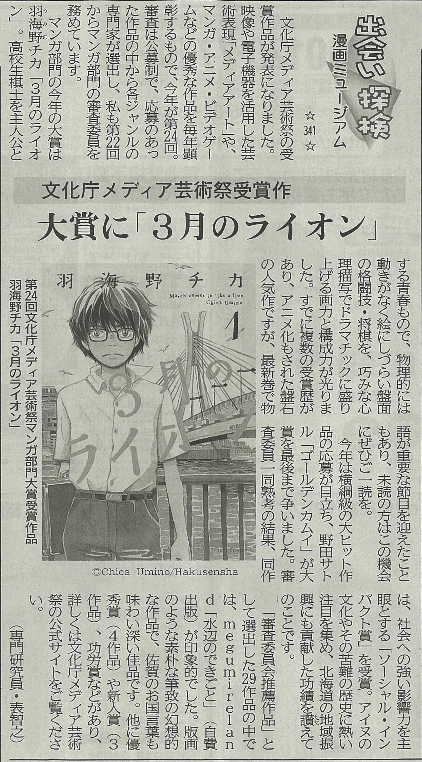 (341)文化庁メディア芸術祭受賞作 大賞に「3月のライオン」