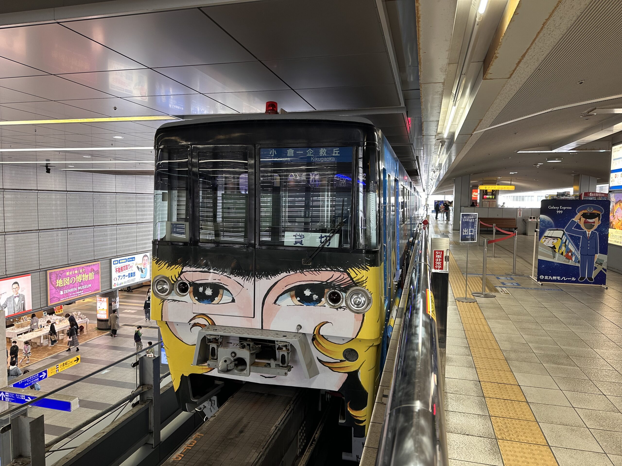 小倉駅を起点に小倉北区から小倉南区へ市街地を走る北九州モノレールでは、2010年からラッピング車両「銀河鉄道999号」を運行しています。2017年以降は、2代目に当たる現在の車両が運行中で、初代・2代目ともに松本零士先生がデザインされています。